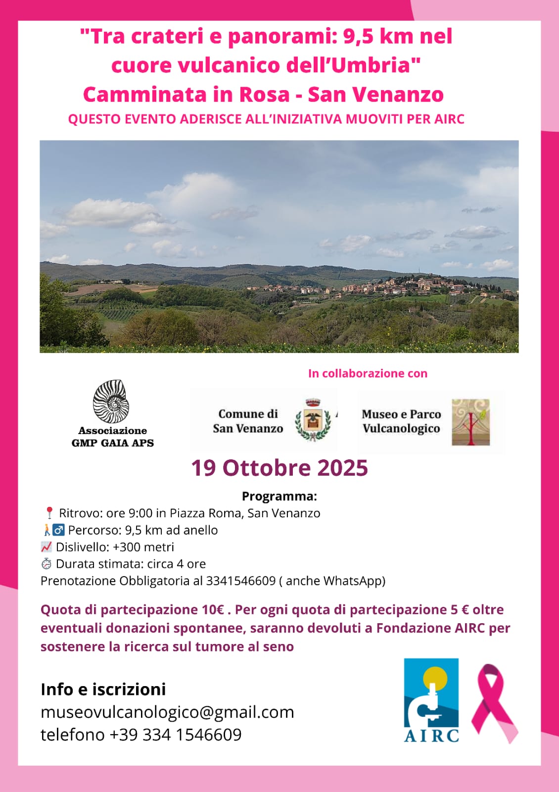L’Associazione GMP Gaia APS, in collaborazione con il Comune di San Venanzo e il Museo e Parco Vulcanologico, organizza domenica 19 ottobre 2025 la Camminata in Rosa – Tra crateri e panorami: 9,5 km nel cuore vulcanico dell’Umbria, un evento naturalistico e solidale che aderisce all’iniziativa nazionale “Muoviti per AIRC” a sostegno della ricerca sul tumore al seno.