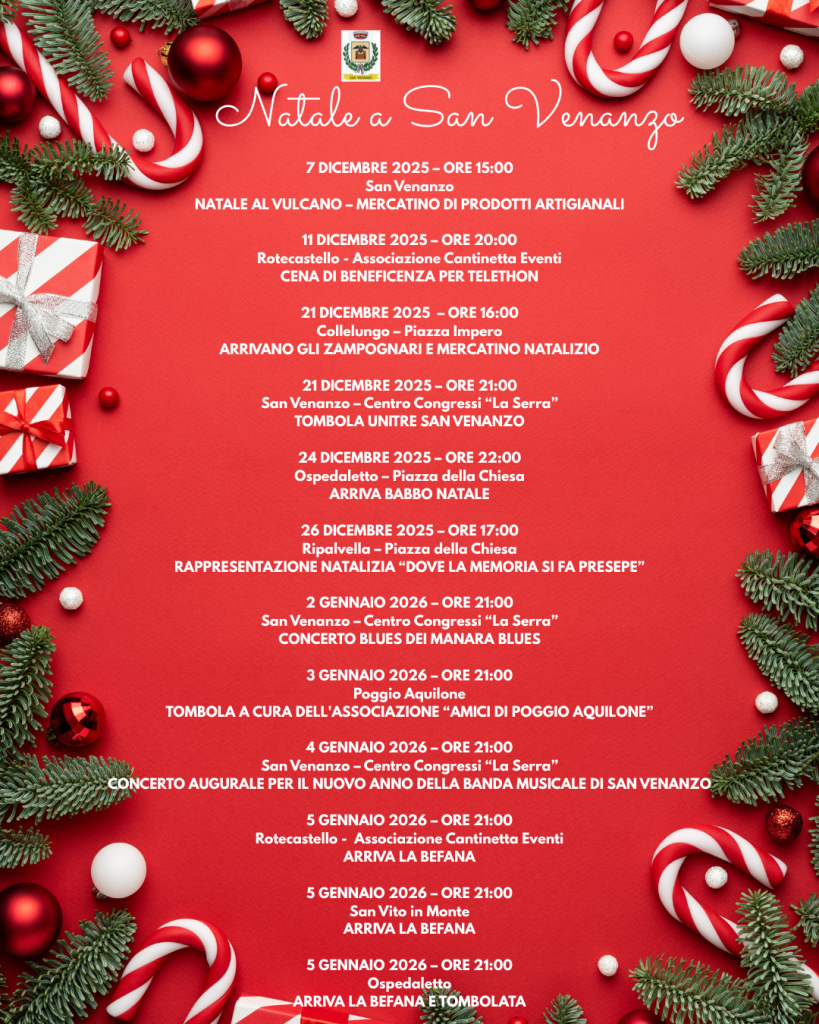 Venerdì 2 gennaio 2026 a San Venanzo è la volta del concerto blues dei Manara Blues, in programma alle ore 21:00 presso il Centro Congressi “La Serra”; sabato 3 gennaio a Poggio Aquilone serata all’insegna della tradizionale tombola, a cura dell’Associazione “Amici di Poggio Aquilone”; domenica 4 gennaio, a San Venanzo, il Centro Congressi “La Serra” alle ore 21:00 ospita il concerto augurale per il Nuovo Anno della Banda Musicale di San Venanzo.